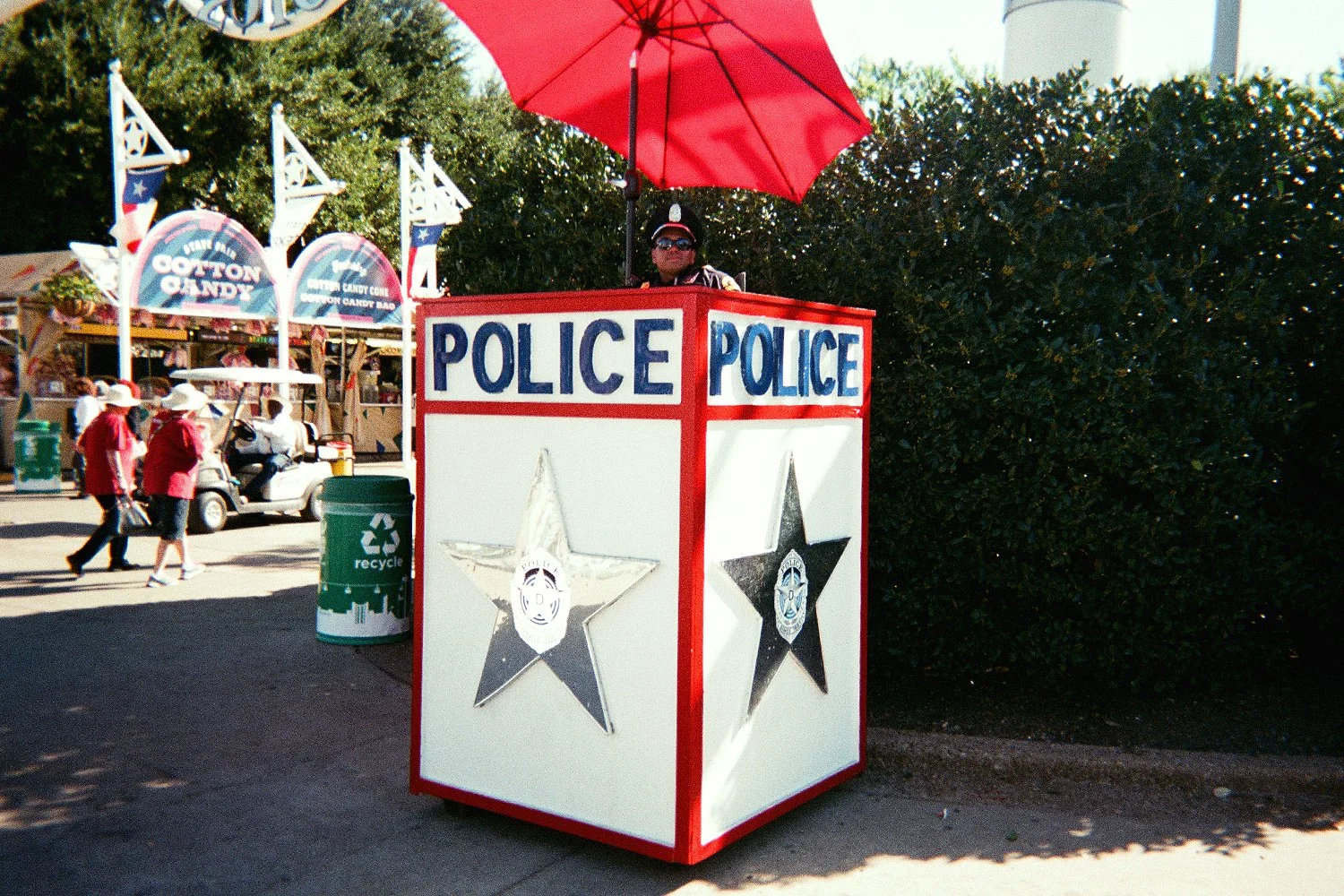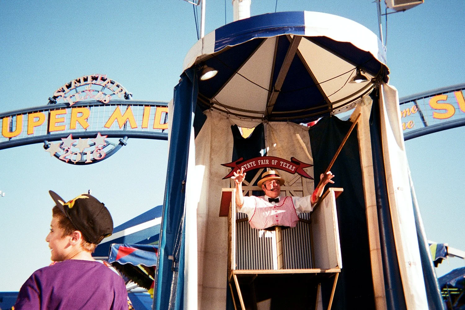 Surrounding the Cotton Bowl stadium, the fair is presented like an exuberant wedding cake sprinkled with police booths that raise above ground like lifeguard stations and ketchup stands that refuel a proto-craving for corn syrup and tartaric acid. No corn dog goes undressed and no petty crime goes unnoticed. The uninterrupted availability of stimulus at the fair is overwhelming: fried spaghetti and meatballs, a Taylor Swift museum, a gang-like array of elderly folks readjusting their dentures on motorized scooters, gawking faces of confused children playing with dirty lambs and porcupines while munching on cotton candy. and at the center of it all, a talking monolith.